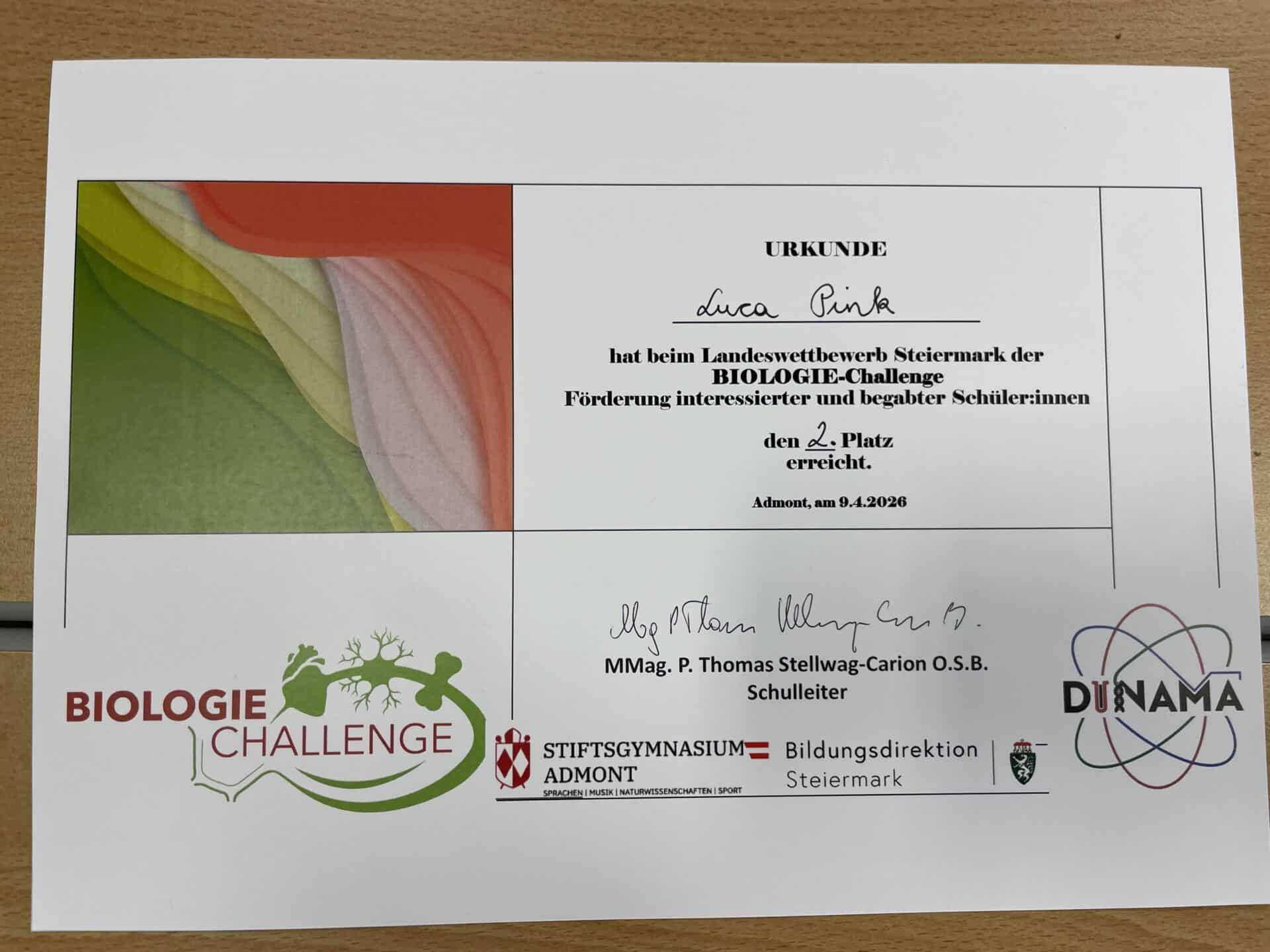 2. Platz für Luca Pink beim Landeswettbewerb der Biologie-Challenge